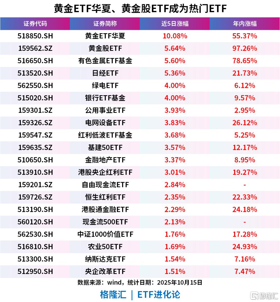 节后5个交易日,黄金ETF华夏(518850)、黄金股ETF(159562)领涨市场,成为热门ETF。
