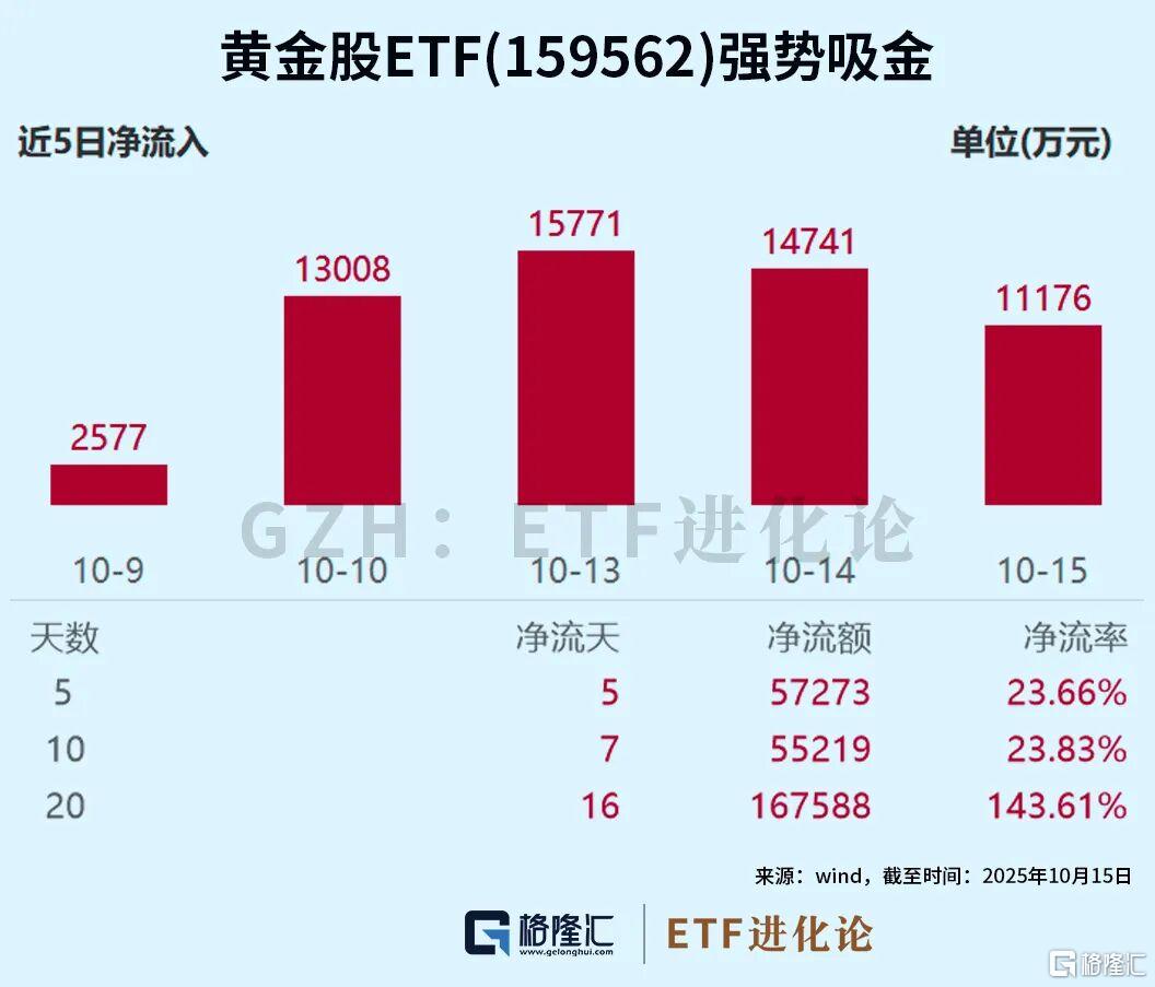 比如,黄金ETF华夏(518850),近20个交易日吸金13.03亿元,年内资金流入39.55亿元;黄金股ETF(159562)近20个交易日吸金16.76亿元,年内资金流入22.28亿元。