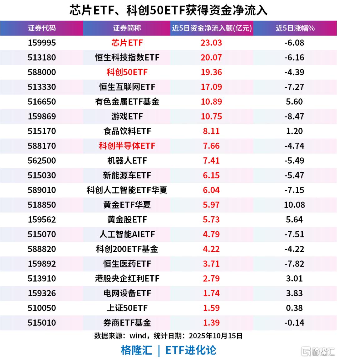 其中,科创50ETF(588000)、芯片ETF(159995)、科创半导体ETF(588170)近5个交易日分别逆势吸金23.03亿元、19.36亿元、7.66亿元。