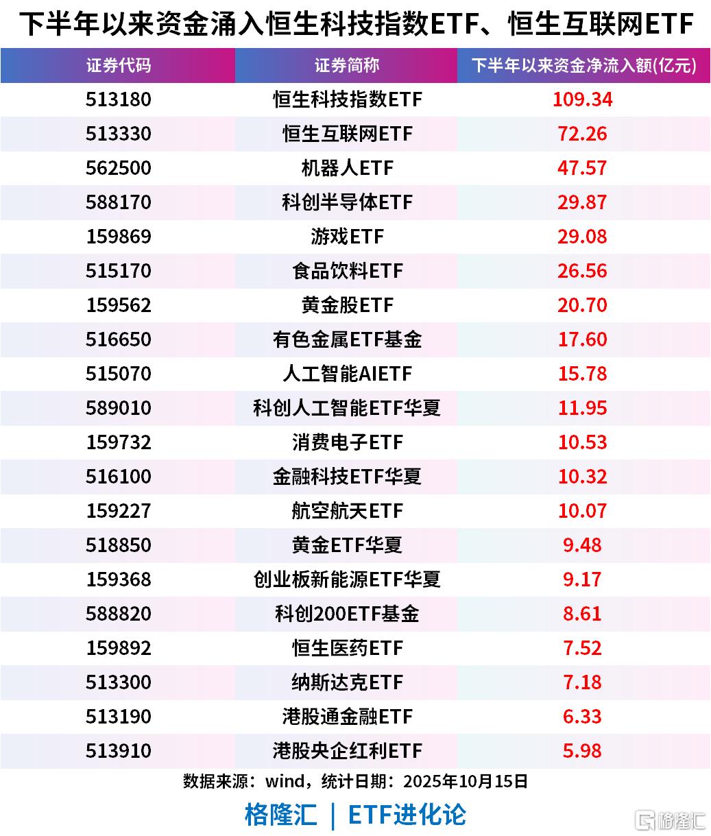 节后5个交易日,恒生科技指数ETF(513180)吸金20.07亿元,恒生互联网ETF(513330)吸金17.09亿元;下半年以来,两者资金净流入额分别为109.34亿元、72.26亿元。