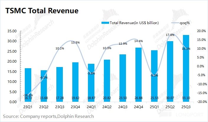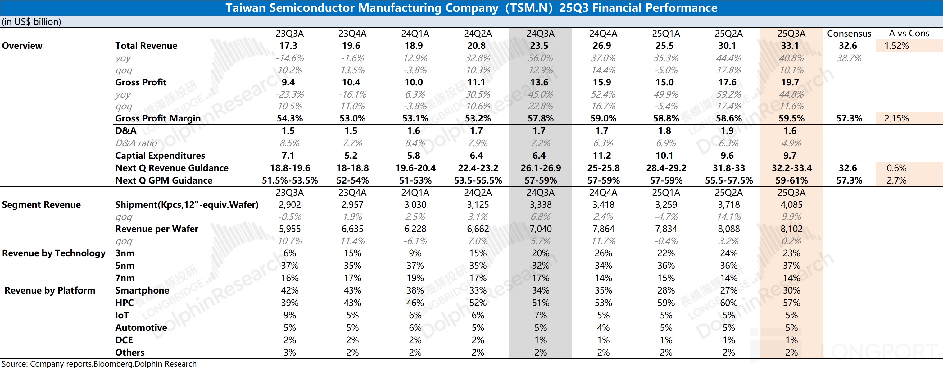 台积电在 2025 年第三季度实现营收 331 亿美元,超出公司此前指引区间(318-330 亿美元)。本季度收入环比增长 10%,主要受手机业务和 AI 芯片增长带动,以及汇率变化的影响。若从新台币口径看,公司本季度收入环比增长 6%,符合指引区间。