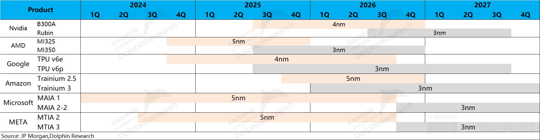 b)制程工艺迭代升级:目前公司 2nm 进展顺利,预计 2026 年苹果、高通等手机芯片将采用 2nm 制程工艺,而 AI 芯片(博通、AMD、英伟达等厂商)也将在 2025 年下半年开始从 4nm 平台逐步迁移至 3nm 工艺。