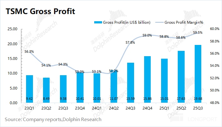 台积电在 2025 年第三季度实现毛利 19.7 亿美元,环比增长 11.6%。其中毛利率 59.5%,环比提升 0.9pct,公司本季度主要是在规模效应影响下,摊薄了部分单位成本。