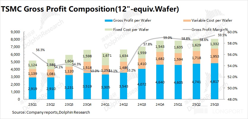 综合以上拆分,本季度台积电单片毛利 4817 美元/片,环比增加 76 美元。公司产品均价略有上升,单位固定成本的减少比单位可变成本的增加量更多,导致公司产品单位成本的下降,是毛利率环比提升的主要因素。