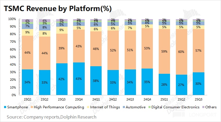 b.下游应用端:公司本季度收入环增的主要来自于机业务,其中 iPhone 新机备货是主推力。受英伟达、博通等 AI 芯片需求的带动,高性能计算依然是公司最大的收入来源,本季度达到 189 亿美元,收入占比 57%。