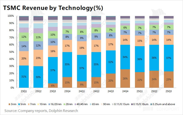 本季度 7nm 以下的收入占比维持在 74%,先进制程领域是公司的核心收入来源。具体来看,本季度公司 3nm 收入占比为 23%,5nm 的收入占比维持在 37%。当前公司的 3nm 和 5nm 产能都已经满产,公司 2nm 工艺也将在年末开始量产。