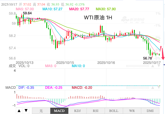 原油短线(1H)走势历经两个交易日次要震荡调整节奏后,继续下行创新低56.80一线。均线系统发散下行,短线客观趋势方向向下不变。早盘油价低位弱势整理,尚未形成新的次要节奏,预计日内原油走势仍将延续下行节奏为主。