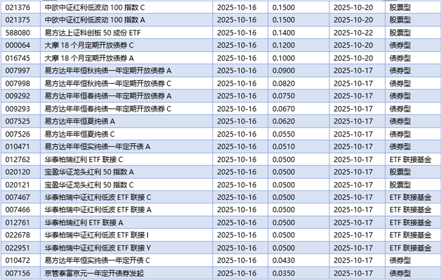 四、10月16日基金分红一览