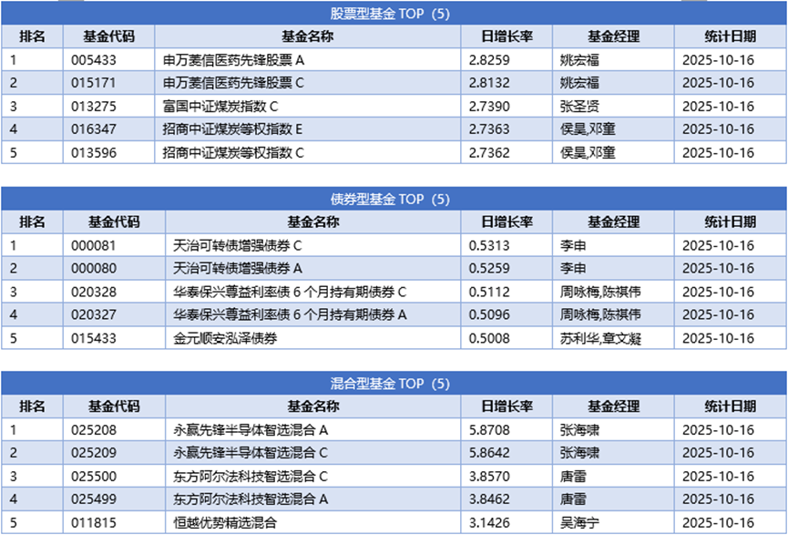 分投资类型看,同样剔除掉分级杠杆及固定收益两类基金的影响,股票型基金冠军为申万菱信医药先锋股票A,日增长率为2.8259%;债券型基金冠军为天治可转债增强债券C,日增长率为0.5313%;混合型基金冠军为永赢先锋半导体智选混合A,日增长率为5.8708%;货币型基金冠军为红土创新货币B,日增长率为0.0185%;ETF联接基金冠军为国泰中证煤炭ETF,日增长率为2.8639%;LOF型基金冠军为国联中证煤炭指数A,日增长率为2.8403%;QDII基金冠军为广发中证香港创新药ETF(QDII),日增长率为2.1534%;下面是不同类型基金日增长率TOP5 (剔除掉分级基金的影响)