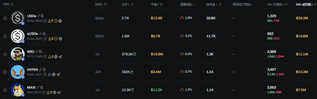 过去 24h ETH 热门代币前五依次为:USDe、sUSDe、BRP、HYPER、MAXI