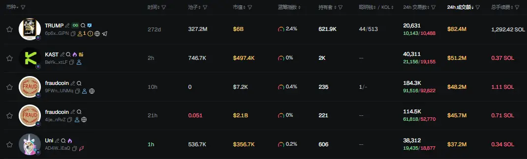 过去 24h Solana 热门代币前五依次为:TRUMP、KAST、fraudcoin、fraudcoin、Uni