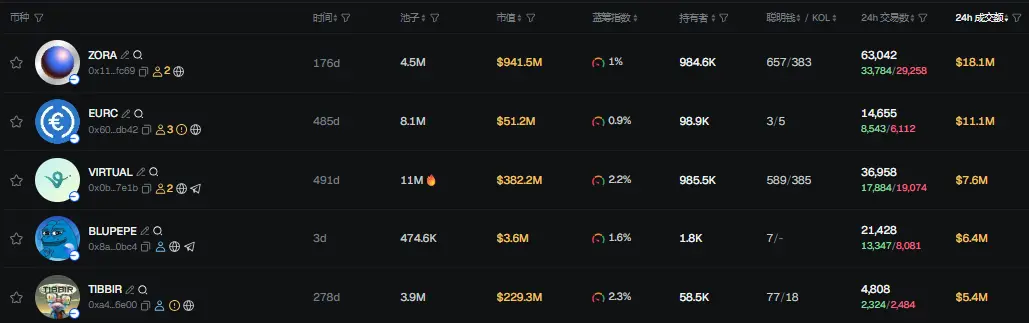 过去 24h Base 热门代币前五依次为:ZORA、EURC、VIRTUAL、BLUPEPE、TIBBIR