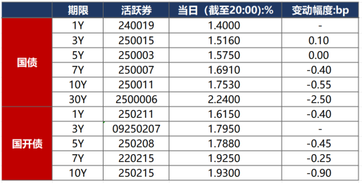 10月16日,受股市下跌及资金面宽松提振,市场情绪有所好转,债市整体偏强。截至北京时间20:00,10年期国债活跃券250011收益率下行0.55bp至1.7530%,10年期国开债活跃券250215收益率下行0.90bp至1.9300%。