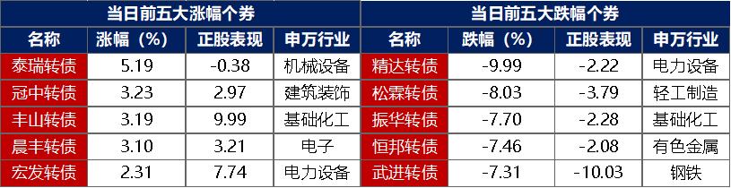 【转债市场主要指数集体收跌】 10月16日,转债市场有所下行,当日中证转债、上证转债、深证转债分别收跌0.72%、0.60%、0.90%。当日,转债市场成交额648.95亿元,较前一交易日缩量108.96亿元。转债市场个券多数下跌,423支转债中,56支收涨,346支下跌,21支持平。当日上涨个券中,泰瑞转债涨超5%,冠中转债、丰山转债、晨丰转债涨超3%;下跌个券中,精达转债跌逾9%,松霖转债跌逾8%。
