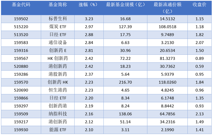 根据巨灵财经统计的数据,2025年10月16日场内ETF基金中标普生科(159502)领涨,涨幅为3.23%,排名靠前的煤炭ETF (515220)、日经ETF (513520)、通信设备(159583),涨幅分别为2.97%、2.88%、2.84%。