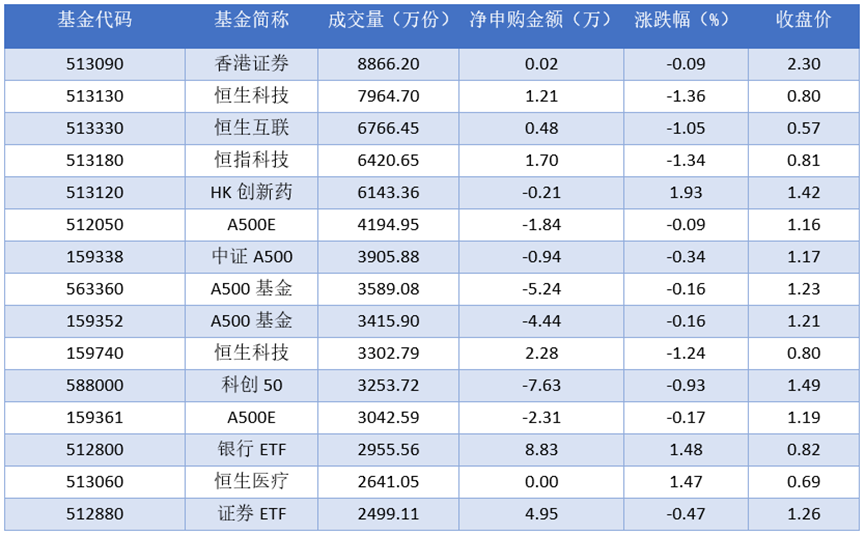 从成交量上来看,2025年10月16日成交量最大的是香港证券(513090),成交量为8866.20万份。排名靠前的恒生科技(513130)、恒生互联(513330)、恒指科技(513180),成交量分别为7964.70万份、6766.45万份、6420.65万份。