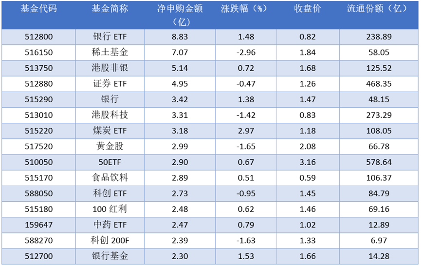 细分到资金流动情况上来看,2025年10月16日净申购金额最大的为银行ETF (512800),当日净申购金额为8.83亿元。排名靠前的稀土基金(516150)、港股非银(513750)、证券ETF (512880),申购金额为7.07亿元、5.14亿元、4.95亿元。