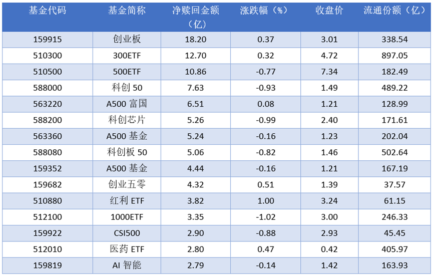 资金流出方面,2025年10月16日净赎回金额最多的是创业板(159915),赎回金额18.20亿元。排名靠前的300ETF (510300)、500ETF (510500)、科创50 (588000),赎回金额分别为12.70亿元、10.86亿元、7.63亿元。