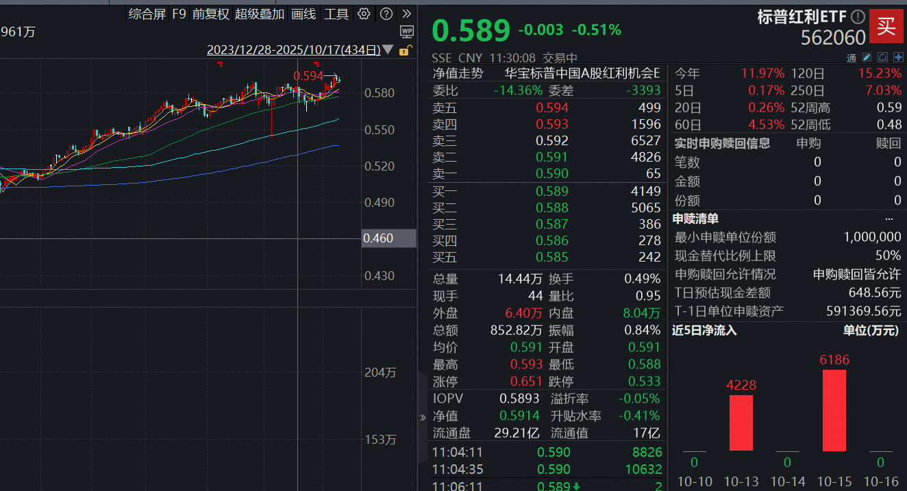 不躲了,“能追牛、能扛熊”的标普A股红利指数领衔主流红利指数,连续两个交易日(10.15、10.16)创新高,稳稳站上5日均线,跟踪该指数的A股红利热门标的——标普红利ETF(562060)同样续创新高,10.16日盘中一度上涨至0.594元,今年以来上涨12.16%*,截至10月17日午盘收盘微跌0.51%,彰显韧性。