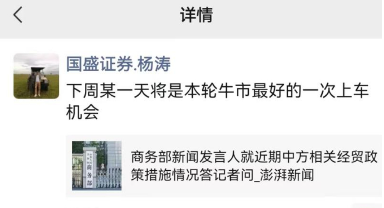 关于关税冲击,多位券商首席看好加仓机会,国盛证券研究所所长杨涛在微信朋友圈称,本轮牛市最好的一次上车机会将来临。