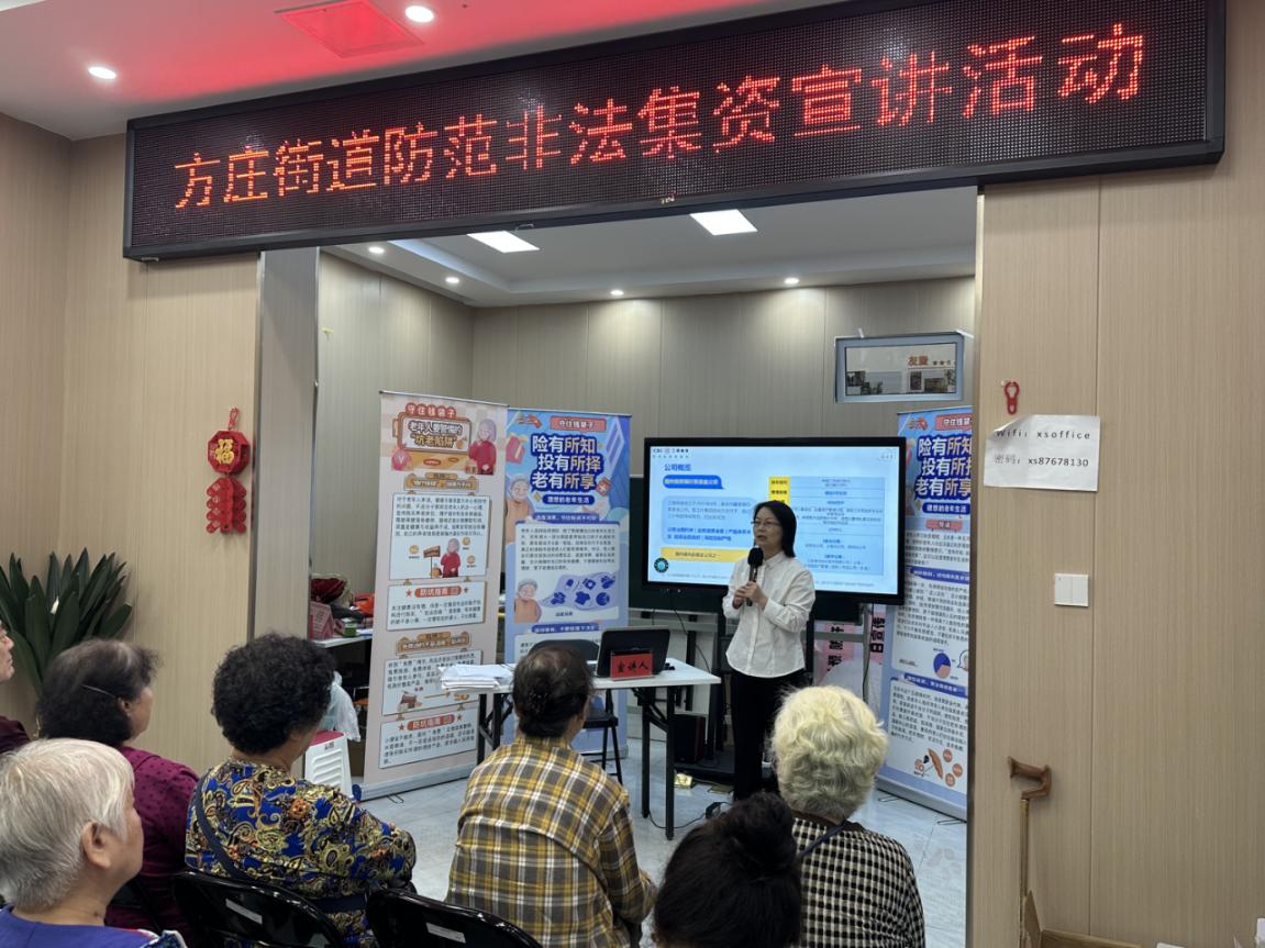 活动现场设立“守护钱袋子”老年人专题系列海报,来自投教基地的讲师精心为社区居民们准备了图文并茂、干货满满的防非知识,聚焦涉老非法金融活动常见形式,通过讲座深入剖析“以房养老”“低价旅游”“直播间打卡免费领礼品”“网络交友”等典型案例,揭露不法分子利用老年人信息差、寻求养老保障等心理实施诈骗的套路,提醒大家不要轻信他人,保护好个人财产信息,守好自己的养老钱。此外,投教讲师还为居民们普及了新时代养老背景下个人养老服务的丰富多样性,倡导“科学规划、多元储备”的养老理念,引导老年群体树立理性养老规划意识,打破传统养老认知局限。