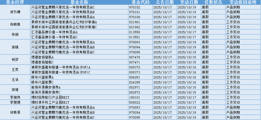 根据巨灵统计的数据显示,近30天(9.18-10.17)共有459只基金产品的基金经理发生离职变动。其中今天(10.17)有23只基金产品发布基金经理离职公告,从变动原因上来看,有8位基金经理是由于工作变动而从管理的14只基金产品中离职。有3位基金经理是由于产品到期而从管理的9只基金产品中离职。