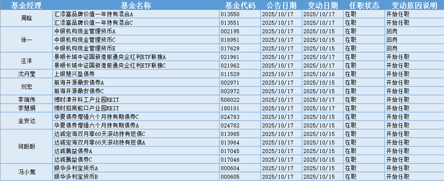 新基金经理上任方面,景顺长城基金汪洋现任基金资产总规模为415.68亿元,管理过的基金都为指数型基金,任职期间回报最高的产品是景顺长城纳斯达克科技ETF联接(QDII)A人民币(017091),为指数型基金,在任职的2年又313天时间内获得132.90%的回报,至今仍在管理该基金。新上任景顺长城中证国新港股通央企红利ETF联接A、景顺长城中证国新港股通央企红利ETF联接C这两只基金产品的基金经理。