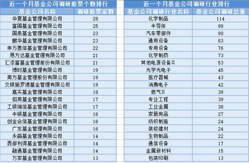 近一个月(9月18日-10月17日),华夏基金参与公司调研的数量最多,共调研28家上市公司,然后调研较为活跃的还有富国基金、国泰基金和鹏华基金,分别调研25家、23家、23家上市公司;从调研行业上来看,基金公司对化学制品行业的上市公司调研次数最多,共有114次,其次是半导体行业,基金公司调研了98次。
