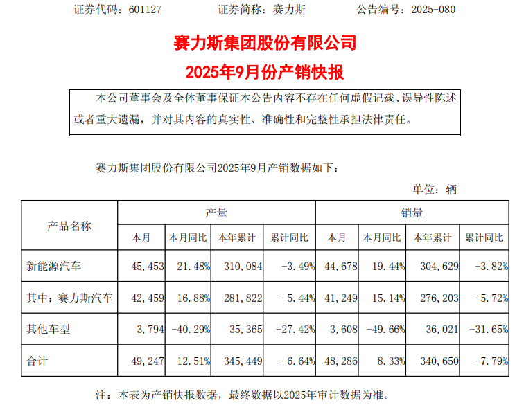 从销量来看,今年1—9月赛力斯新能源汽车累计销量达304,629辆,其中问界品牌累计销量为28.7万辆,占其新能源汽车总销量的94.2%。2025年9月赛力斯新能源汽车销量44,678辆,同比增长19.44%,其中问界M9、M8等主力车型贡献显著。