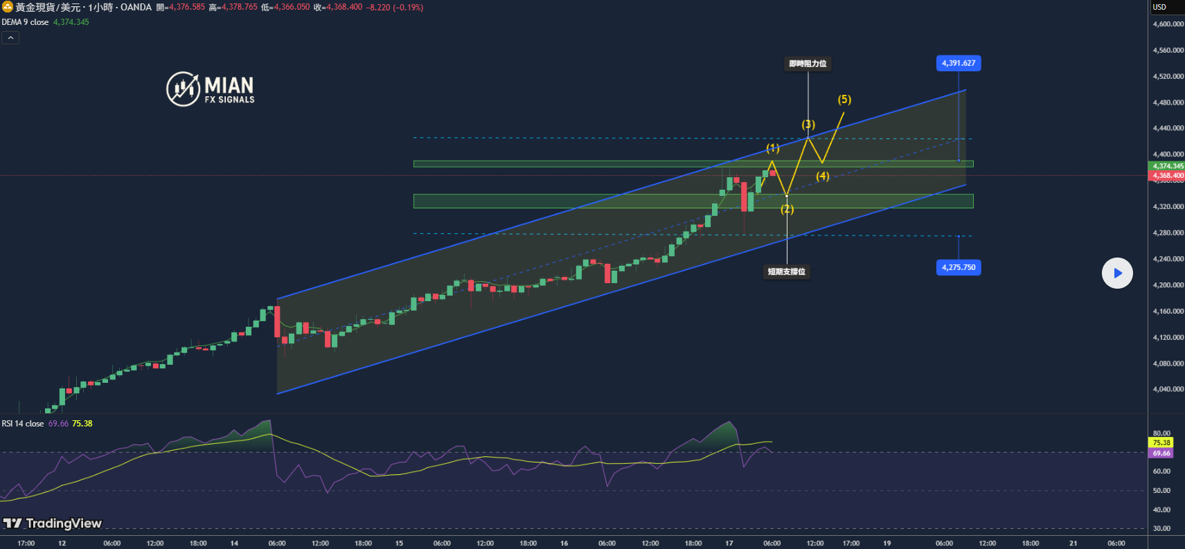 • RSI(H1/H4): 回調後超買狀態暫時緩解,若金價穩守 4,340 上方,可能展開新一輪升勢。