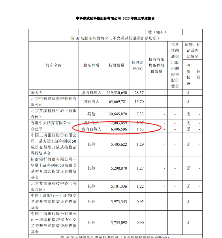 三季报显示,目前寒武纪创始人陈天石为寒武纪第一大股东,持有寒武纪28.57%股份。而知名游资章建平并没有减持,反而在第三季度增持了32万股,截至三季度末,章建平持有640.65万股,持股比例1.53%。