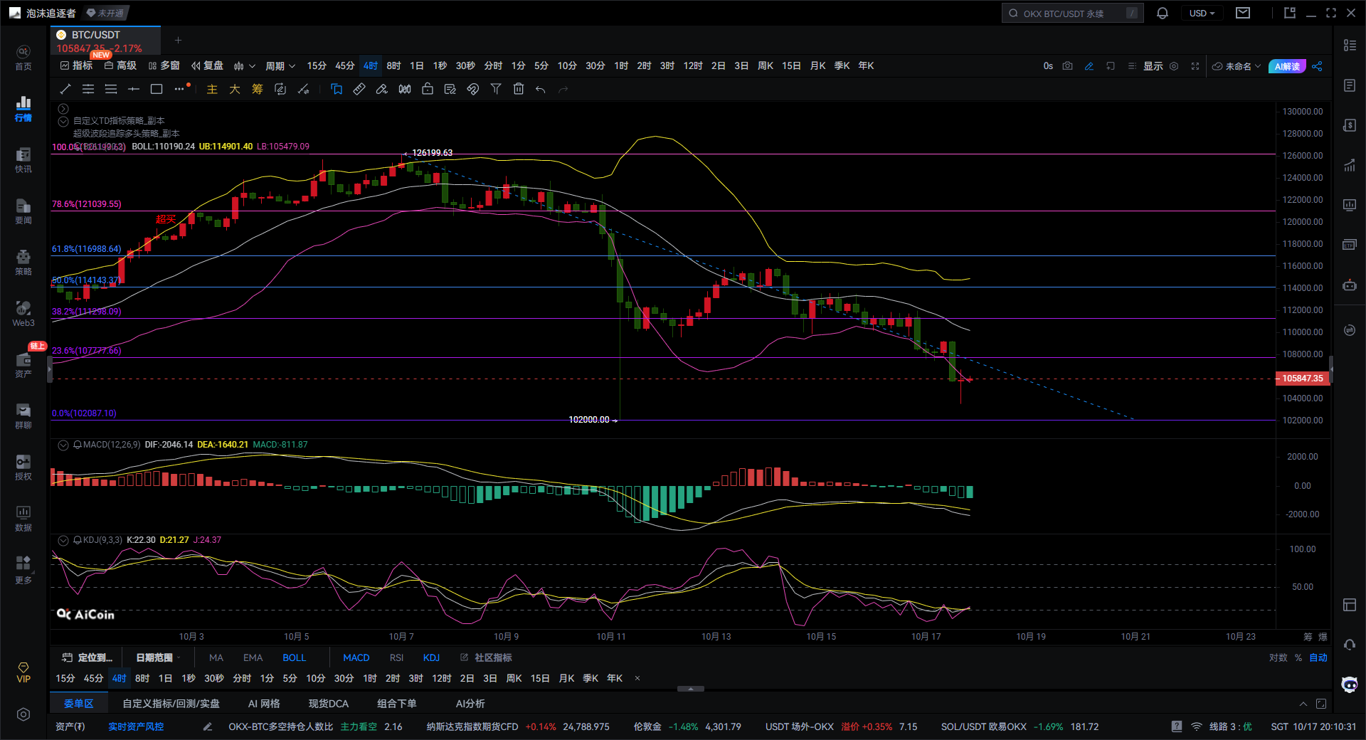 当前价格在斐波那契回调直线约23.6%(107777)以下,也就是说比特币已经跌破第一个关键支撑区,下一支撑在0%(102000)附近,这将成为关键的防守位;若价格反弹,第一个压力位在23.6%(107800),其次为38.2%(111400)。若无法快速收复107800以上,可能会继续测试102000附近支撑。
