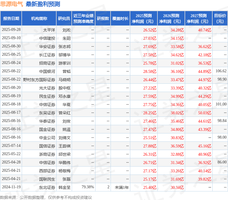 证券之星数据中心根据近三年发布的研报数据计算,东北证券韩金呈研究员团队对该股研究较为深入,近三年预测准确度均值为79.38%,其预测2025年度归属净利润为盈利25.4亿,根据现价换算的预测PE为32.51。