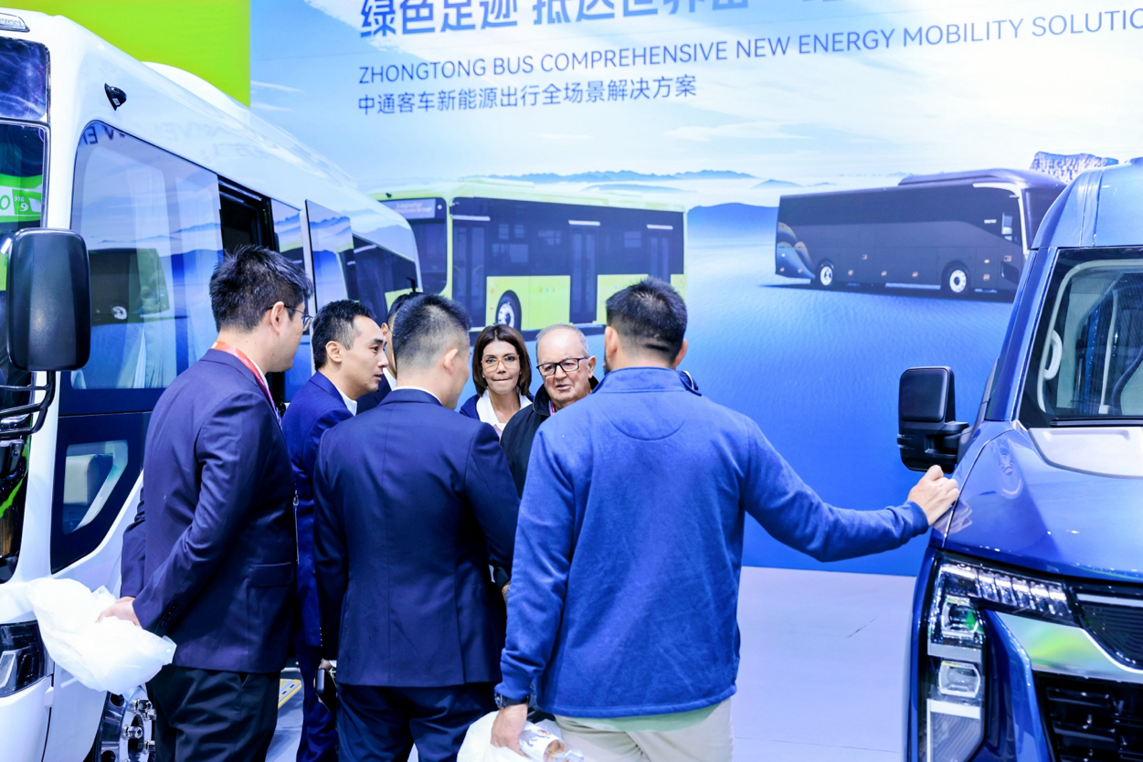 图片说明:外国客商正在新能源展区了解新能源客车产品