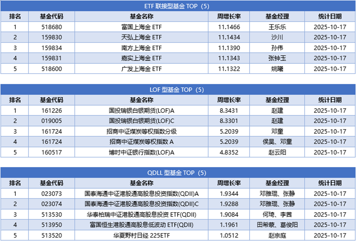 单基金方面,剔除掉创新封基类型基金的影响,上周业绩表现最好的基金为富国上海金ETF,周涨跌幅为11.1466%,为ETF基金;分基金类型看,同样剔除掉分级杠杆及固定收益两类基金的影响,股票型基金冠军为招商中证煤炭等权指数C,周涨跌幅为5.2003%;债券型基金冠军为恒越短债债券D,周涨跌幅为4.4464%; 混合型基金冠军为民生加银金融优选混合A,周涨跌幅为6.1525%; 货币型基金冠军为中信保诚智惠金货币C,周涨跌幅为0.0367%;ETF型基金冠军为富国上海金ETF,周涨跌幅为11.1466% ;LOF型基金冠军为国投瑞银白银期货(LOF)A,周涨跌幅为8.3431%;QDII基金冠军为国泰海通中证港股通高股息投资指数(QDII)A,周涨跌幅为1.9344%;下面是不同类型基金周涨跌幅TOP5 (剔除掉分级基金的影响)