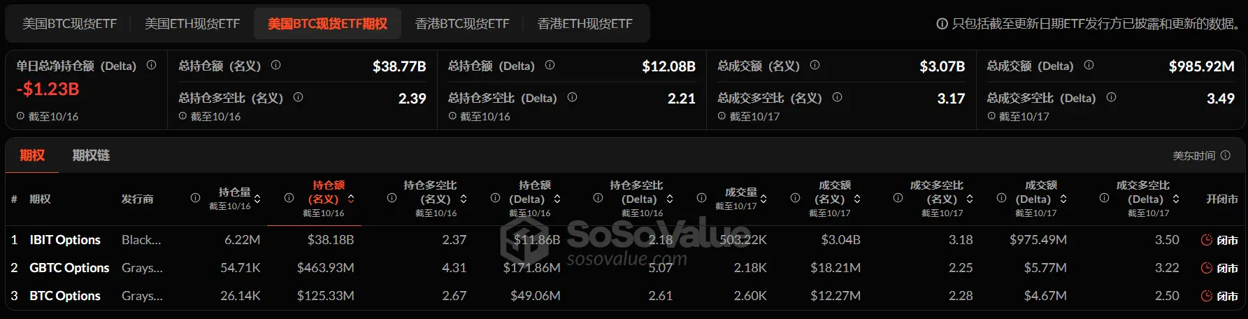 截至 10 月 17 日,美国比特币现货 ETF 期权名义总成交额为 30.7 亿美元,名义总成交多空比为 3.17。