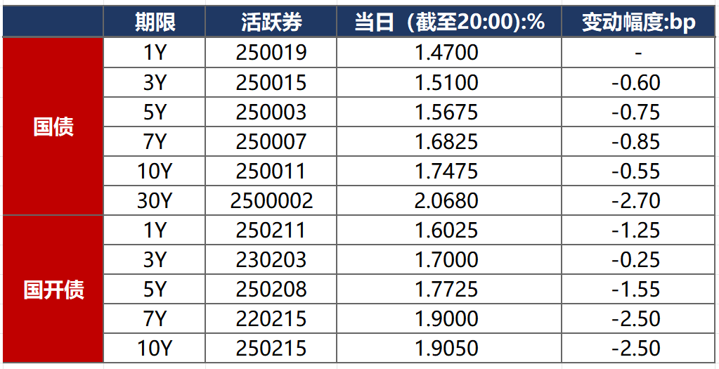 10月17日,股市明显调整,叠加近期中美贸易摩擦升温,资金避险情绪升温,带动债市整体走强。截至北京时间20:00,10年期国债活跃券250011收益率下行0.55bp至1.7475%,10年期国开债活跃券250215收益率下行2.50bp至1.9050%。