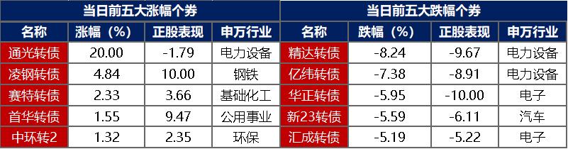 【转债市场主要指数集体跟跌】 10月17日,转债市场跟随权益市场继续下行,当日中证转债、上证转债、深证转债分别收跌0.94%、0.88%、1.04。当日,转债市场成交额603.20亿元,较前一交易日缩量45.75亿元。转债市场个券多数下跌,415支转债中,52支收涨,351支下跌,12支持平。当日上涨个券中,通光转债涨停20%,灵康转债涨超4%;下跌个券中,精达转债跌逾8%,亿纬转债跌逾7%。