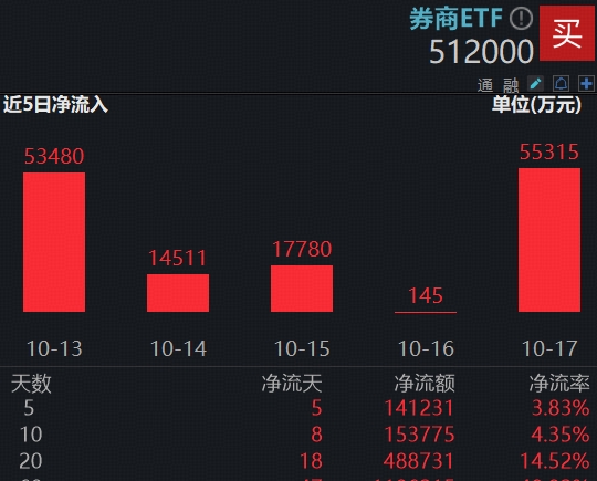 高增长+低估值,券商板块近期吸引资金持续涌入。上交所数据显示,券商ETF(512000)近5日连续获资金净流入14.12亿元,近20日资金更是累计净流入48.87亿元。