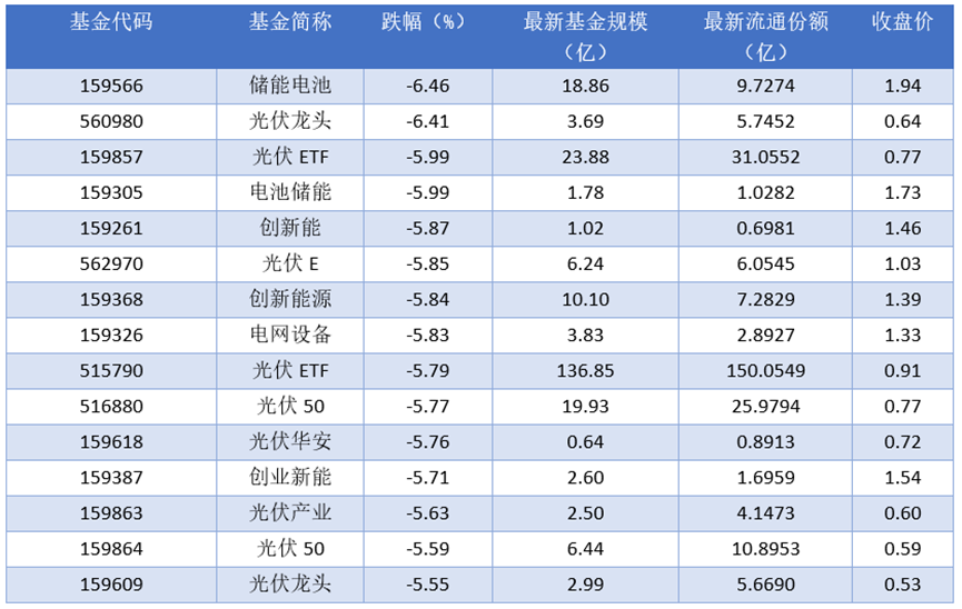 下跌方面,2025年10月17日跌幅最大的是储能电池(159566),跌幅达到6.46%。排名靠前的光伏龙头(560980)、光伏ETF(159857)、电池储能(159305),跌幅分别为6.41%、5.99%、5.99%。