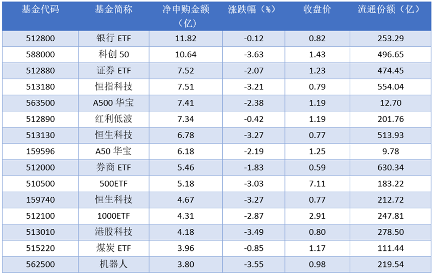 细分到资金流动情况上来看,2025年10月17日净申购金额最大的为银行ETF (512800),当日净申购金额为11.82亿元。排名靠前的科创50 (588000)、证券ETF (512880)、恒指科技(513180),申购金额为10.64亿元、7.52亿元、7.51亿元。