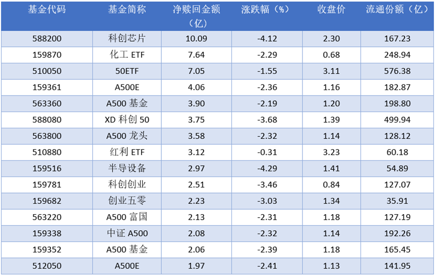 资金流出方面,2025年10月17日净赎回金额最多的是科创芯片(588200),赎回金额10.09亿元。排名靠前的化工ETF(159870)、50ETF (510050)、A500E(159361),赎回金额分别为7.64亿元、7.05亿元、4.06亿元。