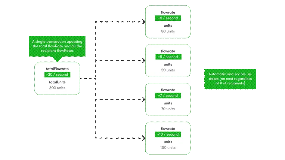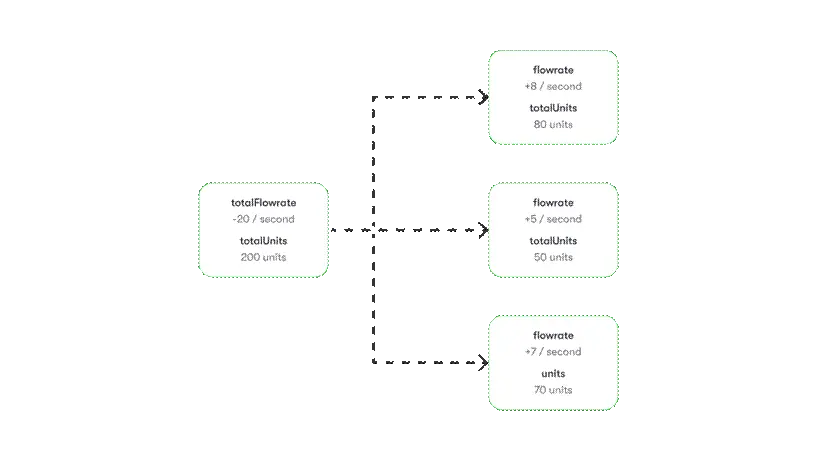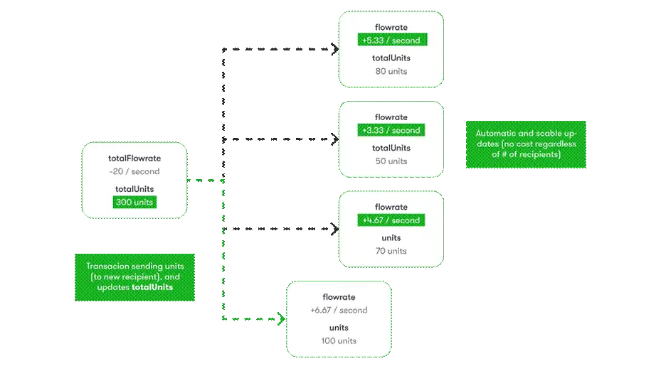 该图展示了一个分发者(Distributor)将资金以流的形式发送给多个池子成员,每个成员持有不同的单位数。