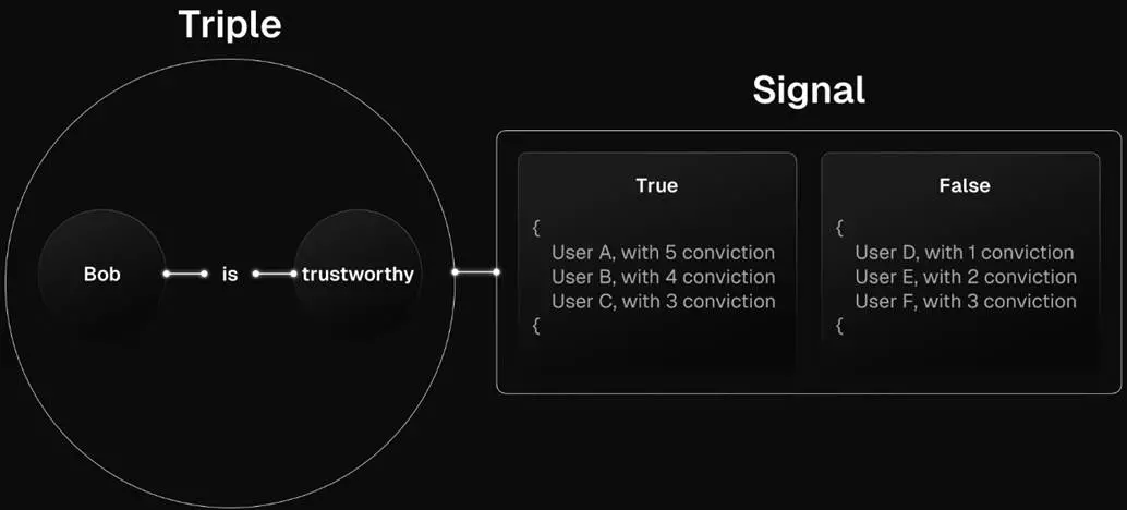 用户可以在 原子(Atoms) 和 三元组(Triples) 上持有仓位(positions),通过增加其在相关实体上的余额来表达自己的立场。