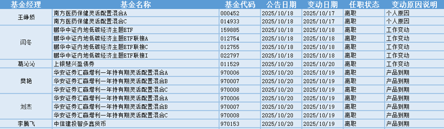 根据巨灵统计的数据显示,近30天(9.21-10.20)共有407只基金产品的基金经理发生离职变动。其中今天(10.20)有14只基金产品发布基金经理离职公告,从变动原因上来看,有2位基金经理是由于工作变动而从管理的5只基金产品中离职。有3位基金经理是由于产品到期而从管理的7只基金产品中离职。有1位基金经理是由于个人原因而从管理的2只基金产品中离职。