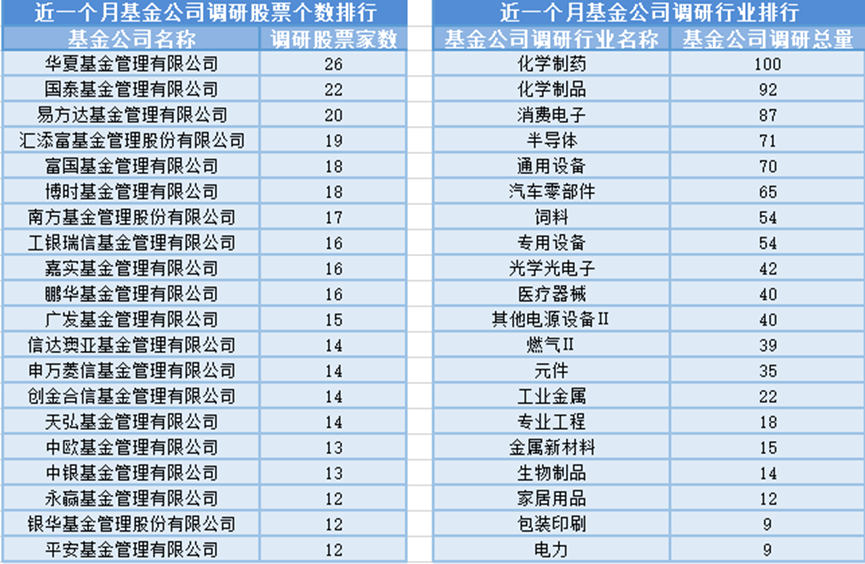 近一个月(9月21日-10月20日),华夏基金参与公司调研的数量最多,共调研26家上市公司,然后调研较为活跃的还有国泰基金、易方达基金和汇添富基金,分别调研22家、20家、19家上市公司;从调研行业上来看,基金公司对化学制药行业的上市公司调研次数最多,共有100次,其次是化学制品行业,基金公司调研了92次。