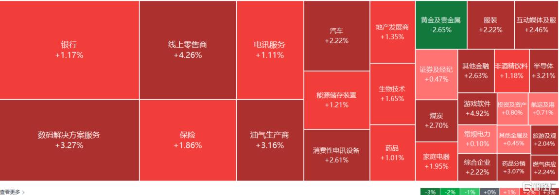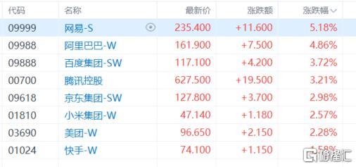权重科技股集体上涨,网易涨超5%,阿里巴巴涨超4%,百度、腾讯控股涨超3%,京东、小米、美团涨超2%,快手涨超1%。