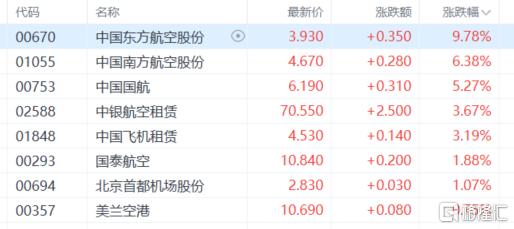 航空股继续上涨,中国东方航空股份涨近10%,中国南方航空股份、中国国航、中银航空租赁、中国飞机租赁等跟涨。