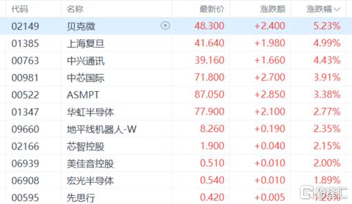 芯片、半导体股上涨,贝克微涨超5%,上海复旦、中兴通讯、中芯国际、ASMPT、华虹半导体、地平线机器人等跟涨。