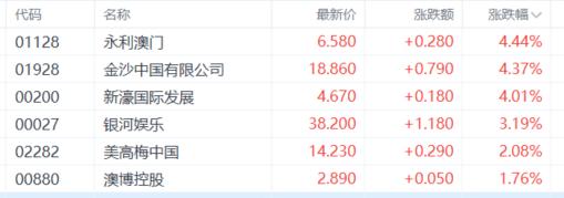 博彩股拉升反弹,永利澳门、金沙中国有限公司、新濠国际发展涨超4%,银河娱乐、美高梅中国、澳博控股等跟涨。